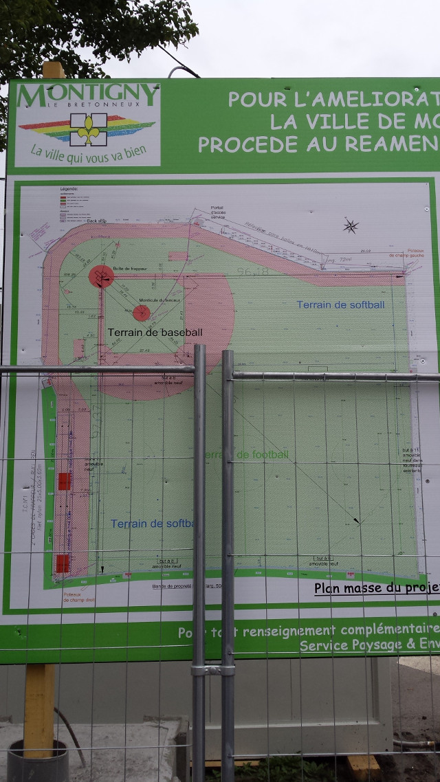 Ceux qui sont passés sur place auront certainement pu étudier en détail le plan de masse affiché, mais pour les autres le voici en HD. Alors que découvrons-nous ? Bien sûr le terrain continuera de pouvoir accueillir un terrain de baseball sénior mais aussi au choix un terrain de football à 11 (ou 2 terrains à 8) avec des buts amovibles comme actuellement, mais il y aura également 2 terrains de softball (ou juniors) avec des bases amovibles dans les angles des champs droit et gauche.