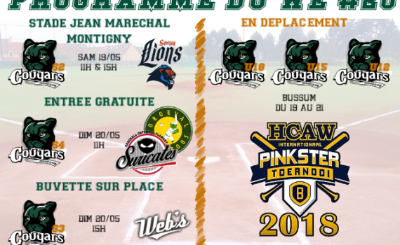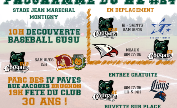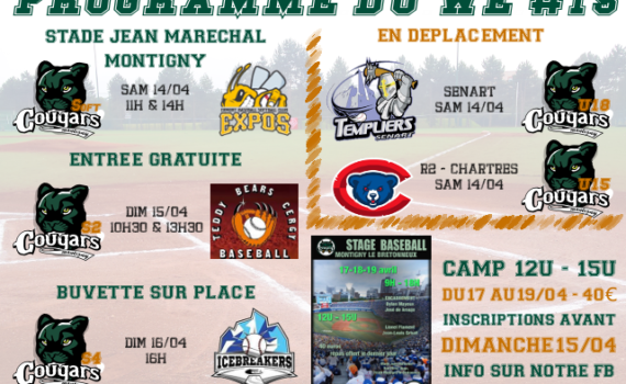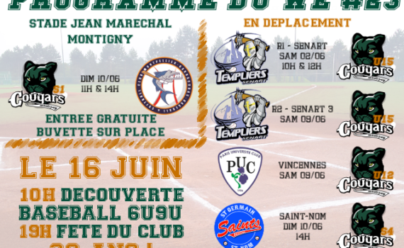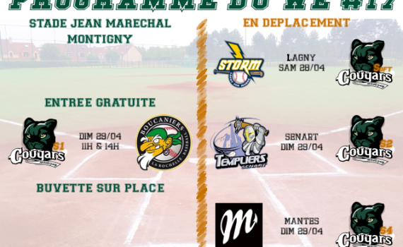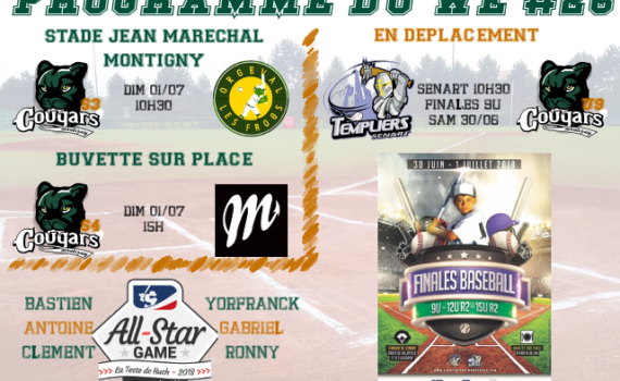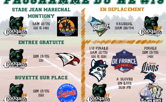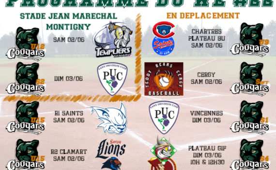 Rendez-vous samedi dès 10H30 à Sénart pour la finale IDF 9U qui réunira nos 2 équipes de Cougies. Ils y retrouverons pour commencer la journée les French Cubs de Chartres et les Saints de Saint-Nom. M1B – Chartres vs Montigny 2 M2C – Montigny vs Saints Puis en fonction des résultats ils rencontreront les…