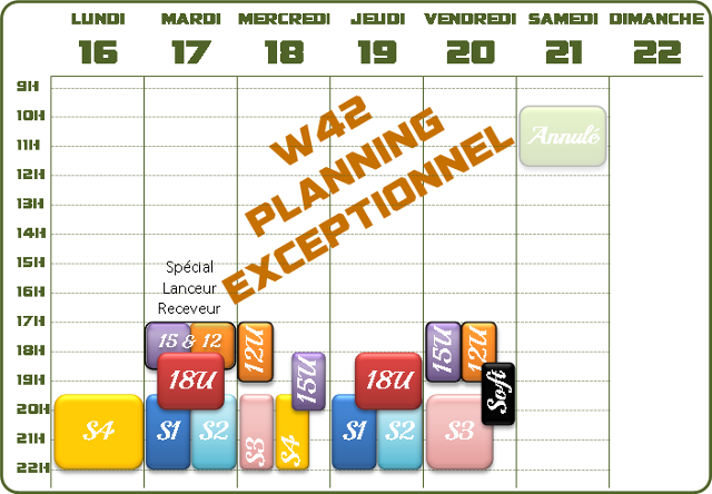 La semaine prochaine nous serons en vacances scolaires pour deux semaines (W43 et W44), les entraînements jeunes seront donc suspendus. Nous vous communiquerons les plannings prévisionnels prochainement.