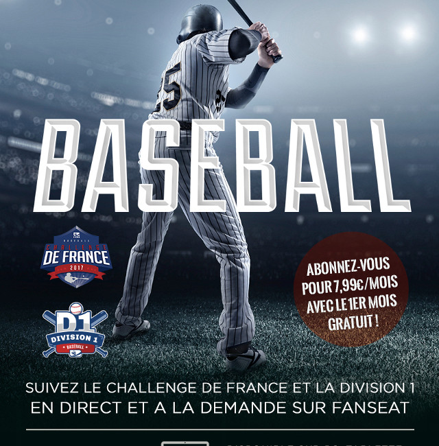 Inscrivez-vous dès aujourd’hui sur Fanseat.com pour ne rien rater des matchs du Challenge de France de baseball 2017 qui débutera ce jeudi 25 mai, et profitez d’un mois gratuit pour voir et revoir des matchs de la division 1 de baseball, mais aussi tout plein d’autres sports.