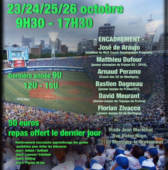 Plus que quelques jours pour vous inscrire à notre stage de baseball 15U, 12U et dernière année 9U. Remplissez le formulaire en ligne et envoyez nous votre règlement de 50€ avant le 15 octobre.