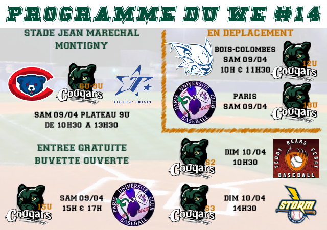 Et les 12U iront à Bois-Colombes face aux Wildcats, les griffes seront de sorties dans les 2 camps pour repartir avec les 2 victoires possibles.