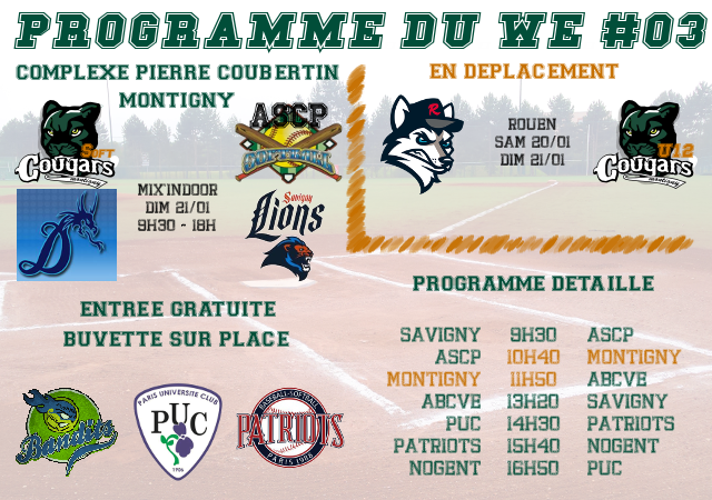 Ce week-end nos 12U se rendront à Rouen pour un tournoi indoor sur deux jours, et le Softball recevra dimanche un plateau du Mixt’In à Montigny.