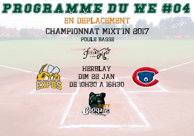 Suite du tournoi Mixt’In 2017 pour notre équipe de Softball qui se déplacera à Herblay pour leur premier plateau de la phase 2 (poule basse). Ils affronteront Les Félins d’Herblay, les Expos d’Ermont, et les French Cubs de Chartres.