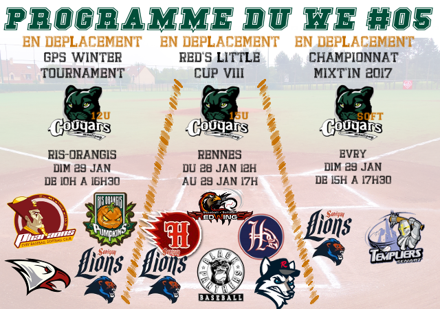 Pour le softball, ils se déplaceront dimanche à Evry pour la suite du Mixt’In 2017. Le plateau réunit de nombreuses équipes (ABCVE, Limeil, Patriot, Herblay, Savigny, Sénart et Montigny), mais les Cougars n’auront que 2 rencontres à 15h20 face aux Lions de Savigny et à 16h30 face aux Templiers de Sénart.