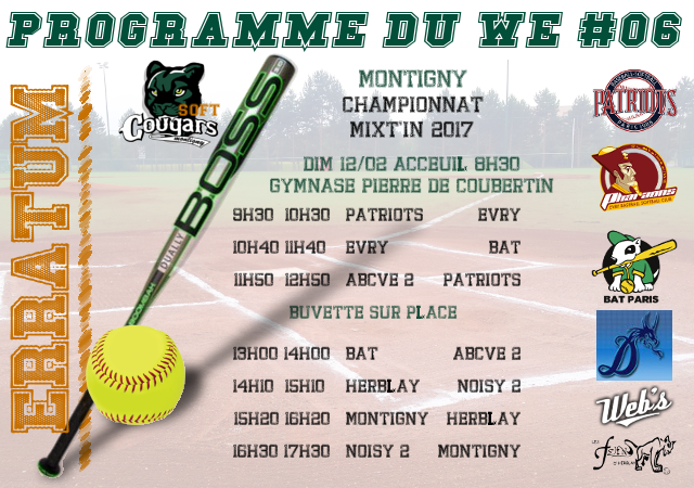 Par contre se déroulera bien une nouvelle journée du championnat Soft’In 2017, où le club accueillera les rencontres de softball en indoor Gymnase Pierre de Coubertin. Une journée complète et 7 matchs au total.