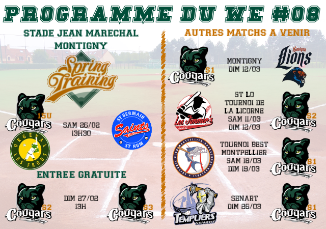 Début du Spring Training avec les premiers matchs amicaux en extérieur. Profitez de la clémence du temps (8-10° et pas de pluie), pour venir encourager vos équipes !