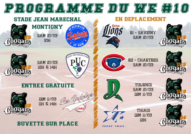 Puis les 12U joueront leur deux premiers matchs de saison en recevant le PUC. Ils sont fins prêts après leur grosse préparation hivernale et avec un moral renforcé par leurs nombreuses victoires.