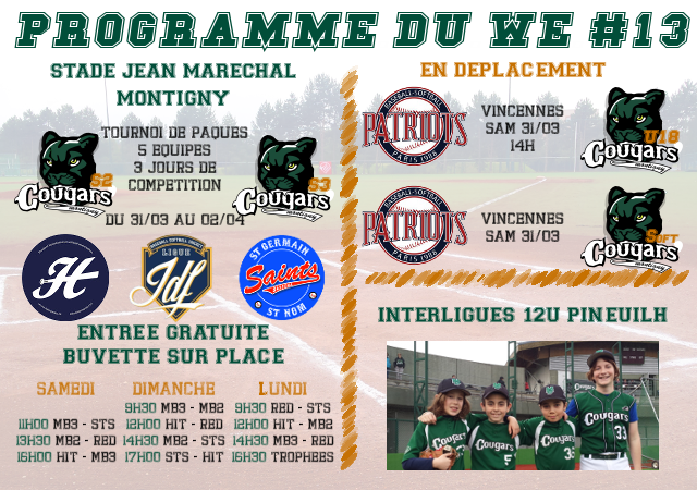 Week-end de Pâques, week-end de 3 jours, alors on en profite pour 3 jours complets de baseball avec notre Tournoi international de Pâques qui réunira les équipes des Hitmanics, des Saints, une sélection de joueurs d’île de France sous la bannière des Red Tigers et les équipes réserves des Cougars (Seniors 2 et Seniors 3).