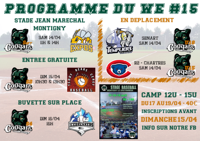 Pour ce week-end rendez-vous samedi pour une journée de softball avec les Cougars face aux Expos d’Ermont à 11h30 et 14H.