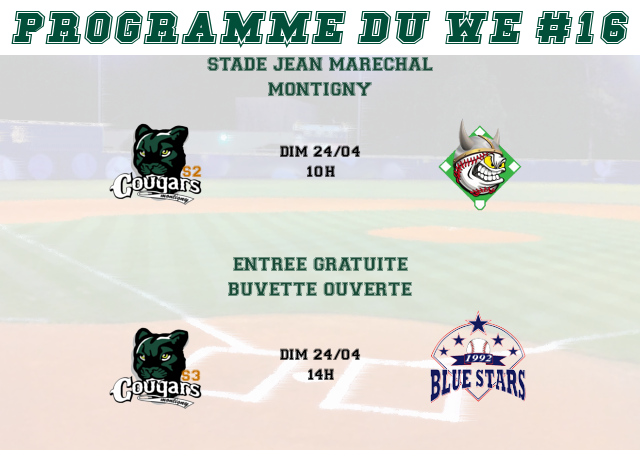 Vacances scolaires obligent, programme allégé pour ce week-end. Mais pas de panique, vous pourrez venir assister à 2 matchs de baseball dimanche.