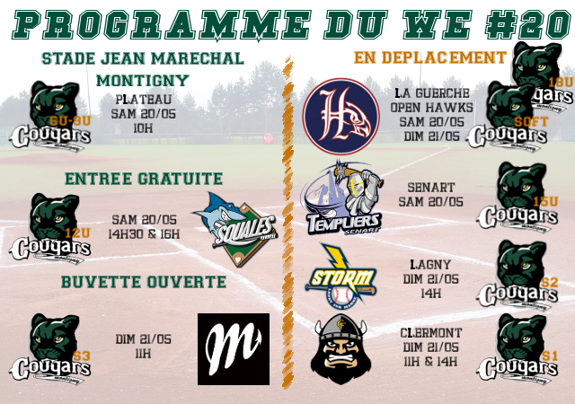 Dimanche à 11h, les Seniors 3 reçoivent les Démons de Mantes actuels seconds du championnat IDF R3. Nos Cougars qui ont gagné le match aller, sont donnés favoris d’autant qu’ils joueront sur leur terrain et avec tous leurs titulaires. Mais il faudra se méfier de cet adversaire, productif au bâton et qui n’a qu’une victoire de moins. La première place sera donc en jeu, alors venez encourager les Seniors 3 pour les aider à rester invaincus cette saison.