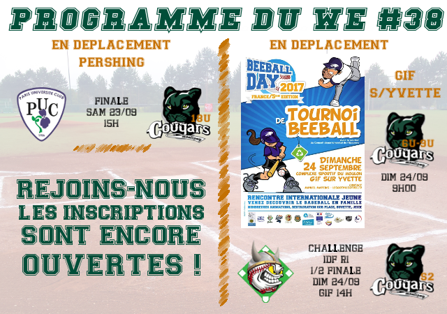 Ce week-end aura lieu la finale 18U qui n’avait pu se jouer il y a 15 jours en raison du mauvais temps. Nos Cougars retrouveront le PUC à Pershing samedi à partir de 15h.