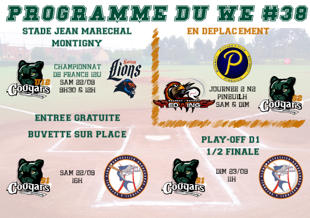 Un très gros week-end de baseball vous attend dès samedi avec une journée continue qui débutera le matin à partir de 9h30 avec une double rencontre Montigny face aux Lions de Savigny pour le Championnat de France 12U.