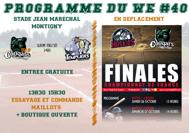 Week-end historique pour le club et donc à ne pas manquer, avec la première Finale du Championnat de France de Division 1 pour Montigny. Les Cougars se rendront à la tanière des Huskies pour leur ravir leur trophée.